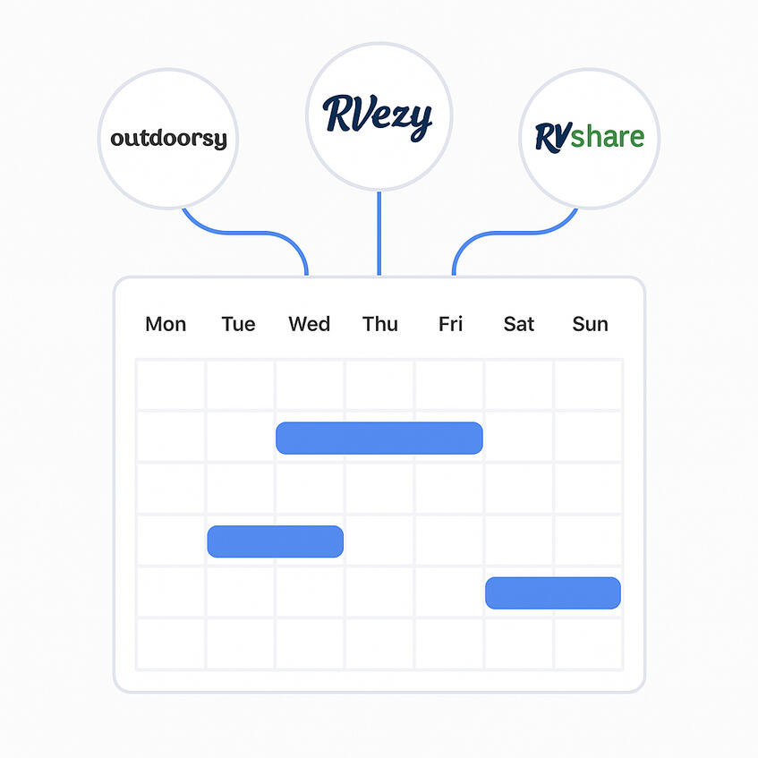 Tired of updating availability on different sites? SyncMyRV connects with Outdoorsy, RVShare, and RVezy to keep your calendar, pricing & listings consistent everywhere. Update it once — we do the rest